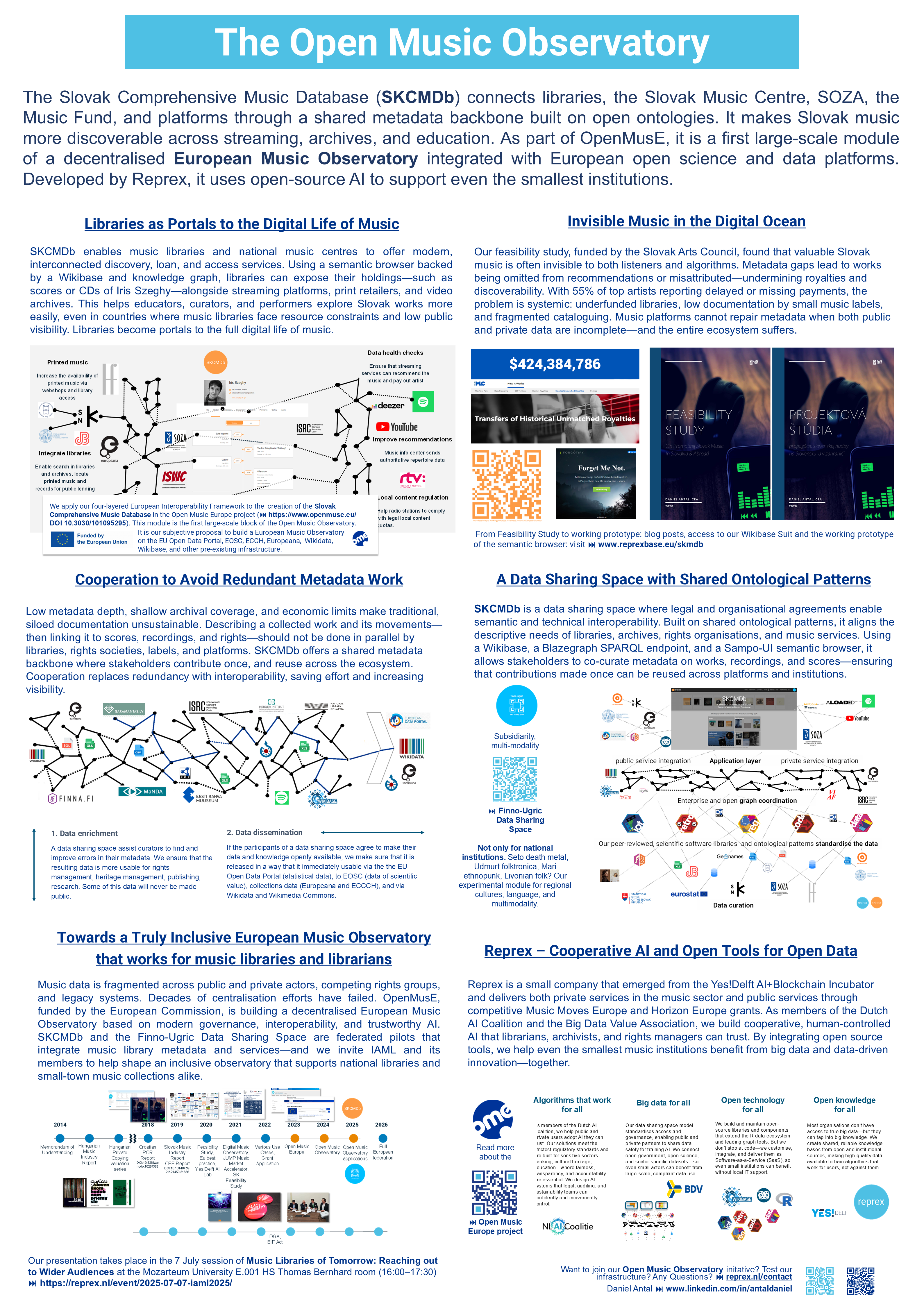 Antal Dániel, az IAML Magyarország új tagja, eredetileg könyvtáros kolléganőjével, Mester Annával és az IAML Szlovákia vezetőjéve, Anna Zilkovával az IAML 2025 kongresszuson az Slovak Comprehensive Music Database (SKCMDb) mögötti adatmegosztási tér jogi, szervezési, és információtudományi kérdéseiről tartottak előadást és poszterprezentációt. Erről a munkáról a magyar szakmai közösség egy vvel ezelőtt a „Networkshop 2024: az oktatás, a kutatás és a közgyűjtemények digitális transzformációja felsőfokon” című konferencián és annak konferencia-kötetében hallhatott és olvashatott (A szlovák adatkicserélési tér magyarországi föderációjának lehetőségei.)